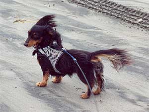 Hallie is an incredible little dog. She was dirty, in heat, fleas and dirty teeth when she came. But she was friendly and happy and confident, so I believe she was probably quite neglected but hopefully not abused. She must have lived in a house because I don't have a doorbell and from the first, if a doorbell would sound on the TV, she would run to the front door to sit and stare up at it. She was housebroken, and had no bad habits at all. Just a wonderful little girl with a great personality and a joy for life. She settled right into a life of pampering. She has a ramp out her back door, that leads to a covered potty area (she has her choice of the covered area or her large fenced back yard). I had a window installed at ground level in the living room so she can lay on her cushions and look out the window without having to jump on the furniture. After going through back surgery with Jessie, I don't want to ever do that again so Hallie is not allowed to jump on furniture at all, I lift her up and down when she wants. We walk/run for a good half hour every day but she has her own stroller for dog shows and shopping that she loves. One of her favorite places is the ocean. We go as often as we can. She loves to dig like mad in the sand, spin circles, have a runny attack, then go back to digging like mad. She will also do this in her garden.